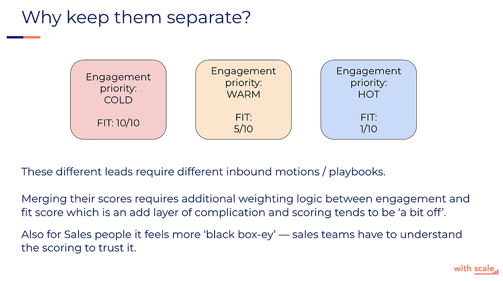 Keeping scores separate makes the logic clearer for sales. It’s transparent, easier to adopt, and removes the “black box” problem that often kills trust in lead scoring.